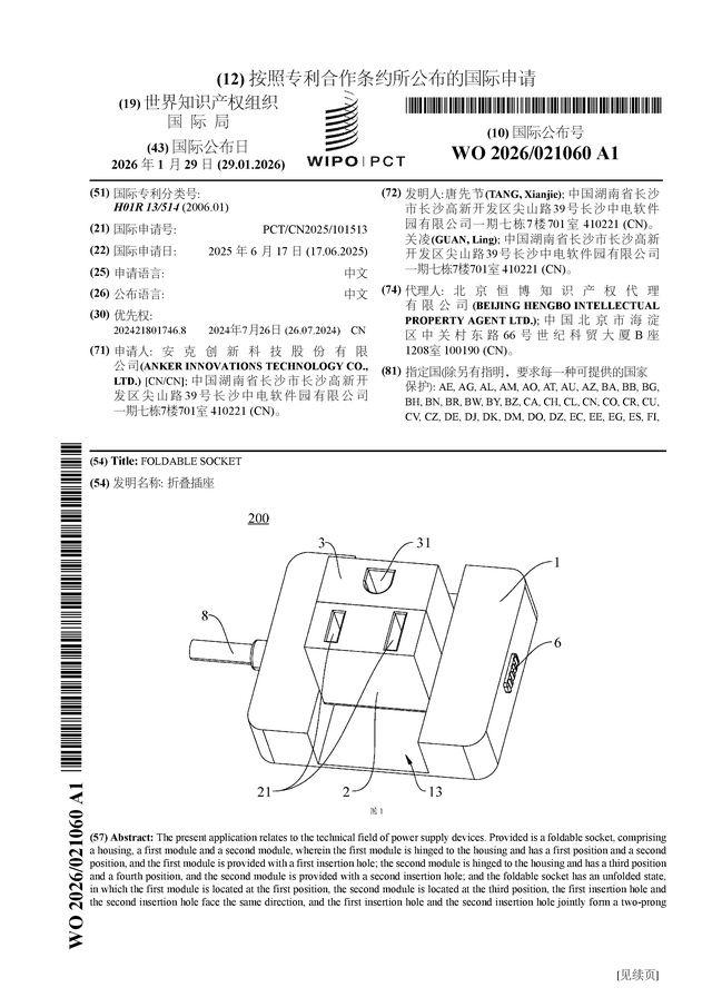 证券之星消息,根据企查查数据显示安克创新(300866)公布了一项国际专利申请,专利名为“折叠插座”,专利申请号为PCT/CN2025/101513,国际公布日为2026年1月29日。