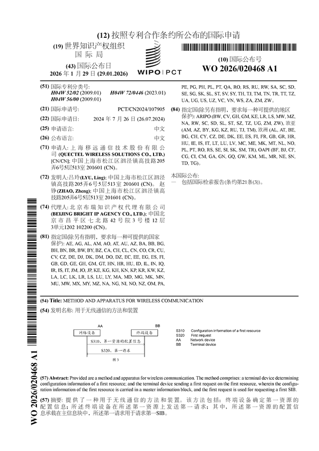 证券之星消息,根据企查查数据显示移远通信(603236)公布了一项国际专利申请,专利名为“用于无线通信的方法和装置”,专利申请号为PCT/CN2024/107905,国际公布日为2026年1月29日。