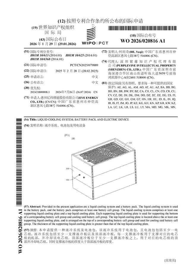 证券之星消息,根据企查查数据显示亿纬锂能(300014)公布了一项国际专利申请,专利名为“液冷系统、电池包及用电设备”,专利申请号为PCT/CN2025/079889,国际公布日为2026年1月29日。