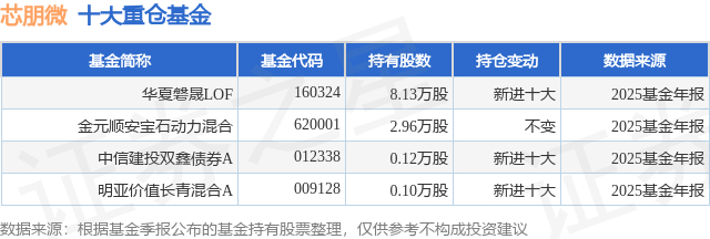 根据2025基金年报公募基金重仓股数据,重仓该股的公募基金共4家,其中持有数量最多的公募基金为华夏基金的华夏磐晟LOF。华夏磐晟LOF目前规模为0.7亿元,最新净值2.2627(1月30日),较上一交易日上涨1.38%,近一年上涨42.07%。该公募基金现任基金经理为刘洋。刘洋在任的基金产品包括:华夏创新视野一年持有混合A,管理时间为2025年3月3日至今,期间收益率为33.43%。