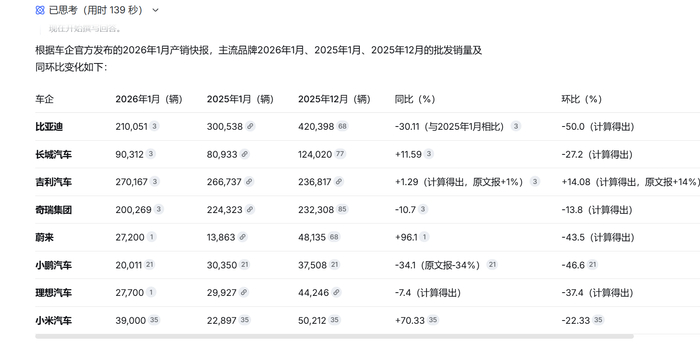 就长城自身而言,算是中规中矩,也谈不上特别好,不过相对还行,是按照自身的节奏和进度在走的。下图是我用Deepseek统计的销量数据(蔚来和理想的AI因为口径原因有几十辆的误差),供参考: