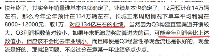 虽然我知道实际可能会小于这个数,但我确实没预计到会小这么多,实际上就是,我考虑到四季度活很多,有时候会有一大笔资本开支,但是我不能因此低估长城的赚钱能力,尤其是量价都表现向好的情况下,从评估未来赚钱能力的角度134亿这个数字“没问题”。