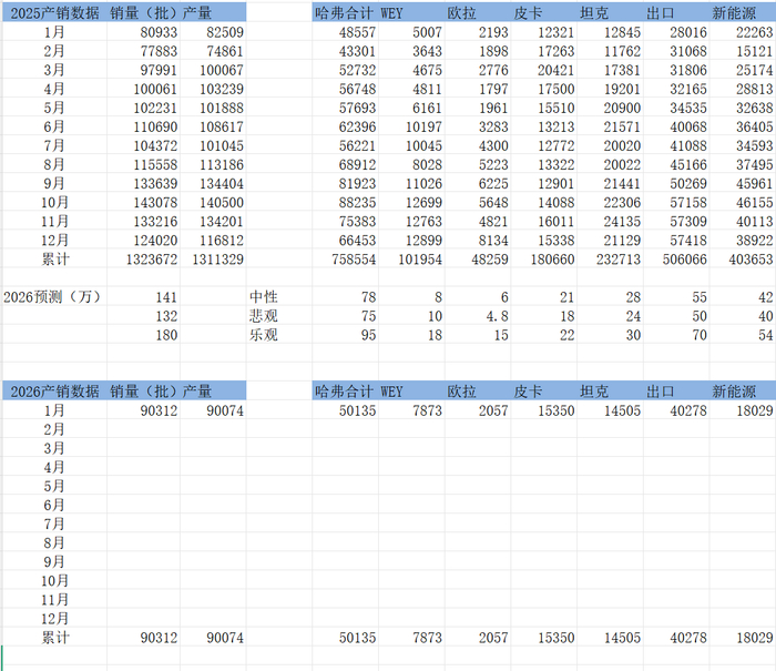 现在年初展望2026年业绩为时尚早,我上述表格里预计了可能得乐观中性悲观的销量,长城的单车利润不考虑“一次性”资本开支,其实已经1万左右这个级别,然后乐观的乘上单车1万的利润差不多就是,141亿吧。理由上期说过,只要销量和经营没出问题,这个数字评估长城近年的“业绩能力”是没问题的。