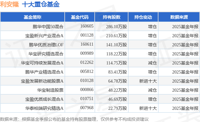 根据2025基金年报公募基金重仓股数据,重仓该股的公募基金共26家,其中持有数量最多的公募基金为鹏华基金的鹏华中国50混合。鹏华中国50混合目前规模为15.5亿元,最新净值2.932(1月30日),较上一交易日下跌1.58%,近一年上涨70.47%。该公募基金现任基金经理为王云鹏。王云鹏在任的基金产品包括:鹏华新材料混合发起式A,管理时间为2023年3月28日至今,期间收益率为40.75%。