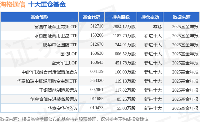 根据2025基金年报公募基金重仓股数据,重仓该股的公募基金共19家,其中持有数量最多的公募基金为富国基金的富国中证军工龙头ETF。富国中证军工龙头ETF目前规模为100.58亿元,最新净值0.8191(2月2日),较上一交易日下跌1.81%,近一年上涨41.69%。该公募基金现任基金经理为王乐乐 牛志冬。王乐乐在任的基金产品包括:富国中证消费50ETF,管理时间为2019年10月14日至今,期间收益率为15.58%;富国中证科技50策略ETF,管理时间为2019年11月15日至今,期间收益率为89.26%;富国中证科技50策略ETF联接A,管理时间为2020年2月20日至今,期间收益率为42.97%。牛志冬在任的基金产品包括:富国中证移动互联网指数(LOF)A,管理时间为2015年5月13日至今,期间收益率为0.53%;富国中证医药主题指数增强A,管理时间为2016年11月11日至今,期间收益率为41.49%;富国中证娱乐主题指数增强(LOF)A,管理时间为2017年3月13日至今,期间收益率为-11.45%;