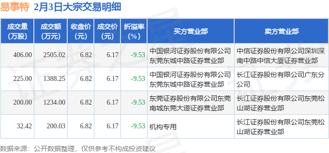 证券之星消息,2月3日易事特发生大宗交易,交易数据如下: