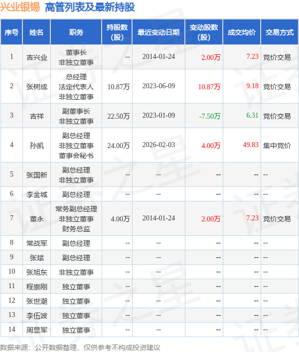 兴业银锡的高管列表及最新持股情况如下: