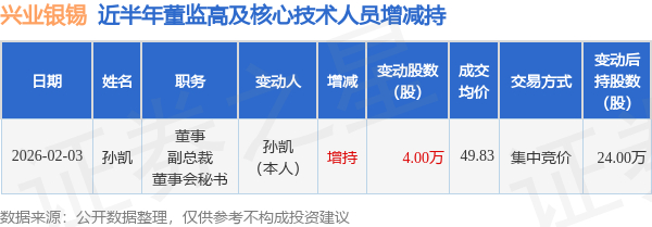 证券之星消息,根据2月3日市场公开信息、上市公司公告及交易所披露数据整理,兴业银锡(000426)最新董监高及相关人员股份变动情况:2026年2月3日公司董事,副总裁,董事会秘书孙凯共增持公司股份4.0万股,占公司总股本为0.0023%。变动期间公司股价下跌7.08%,2月3日当日收盘报51.45元。