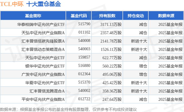 重仓TCL中环的前十大公募基金请见下表:
