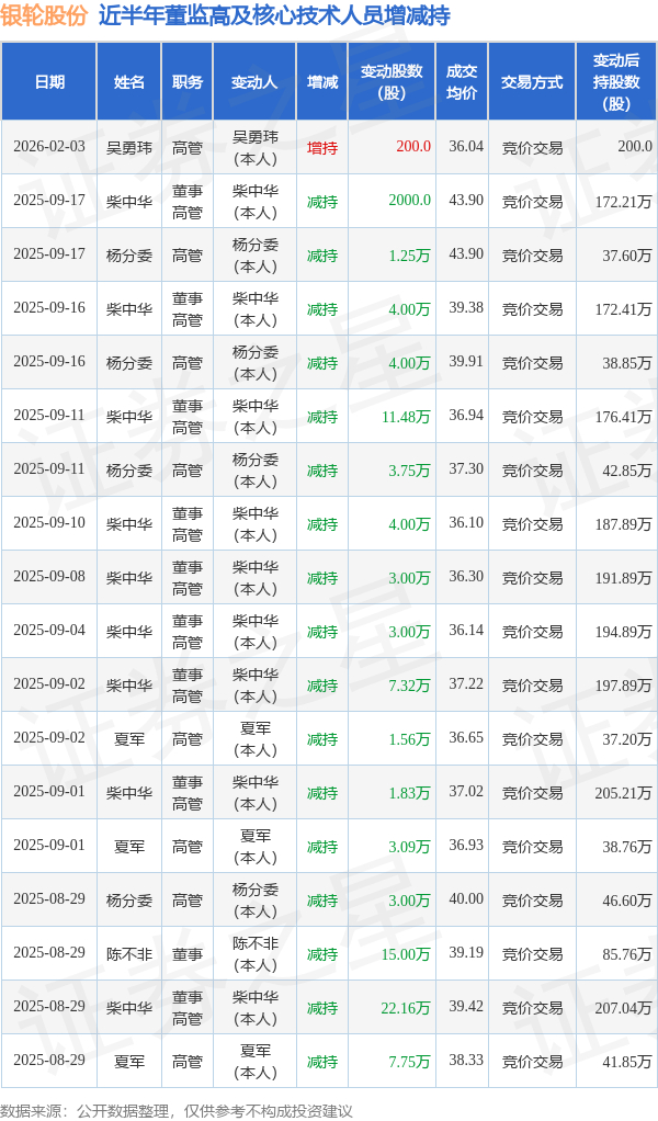 银轮股份近半年内的董监高及核心技术人员增减持详情如下: