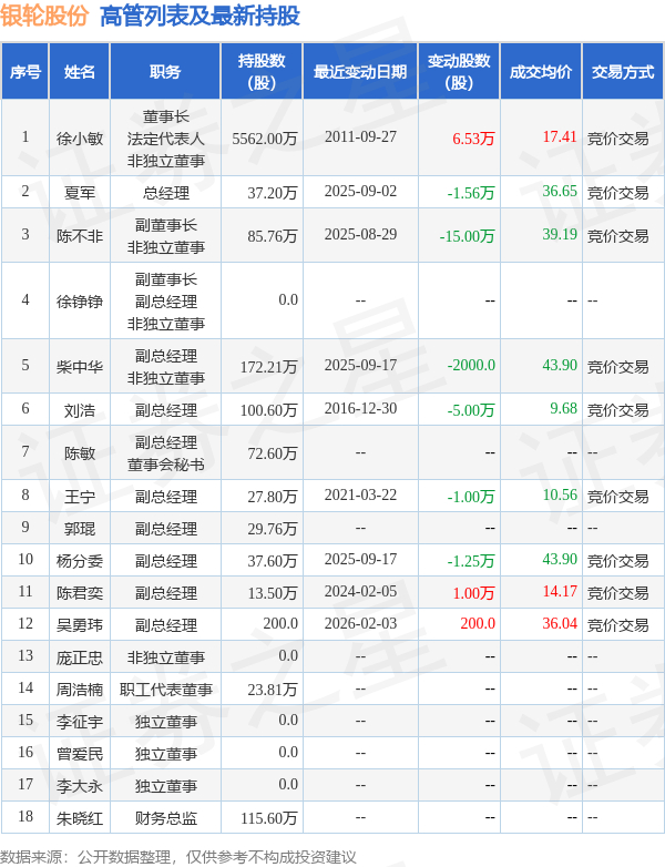 银轮股份的高管列表及最新持股情况如下: