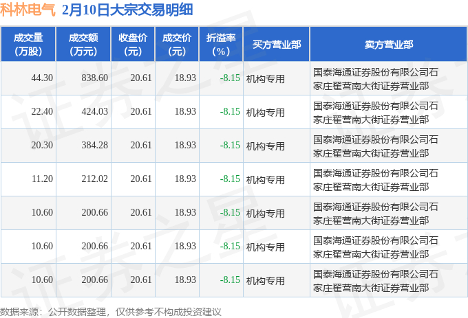证券之星消息,2月10日科林电气发生大宗交易,交易数据如下: