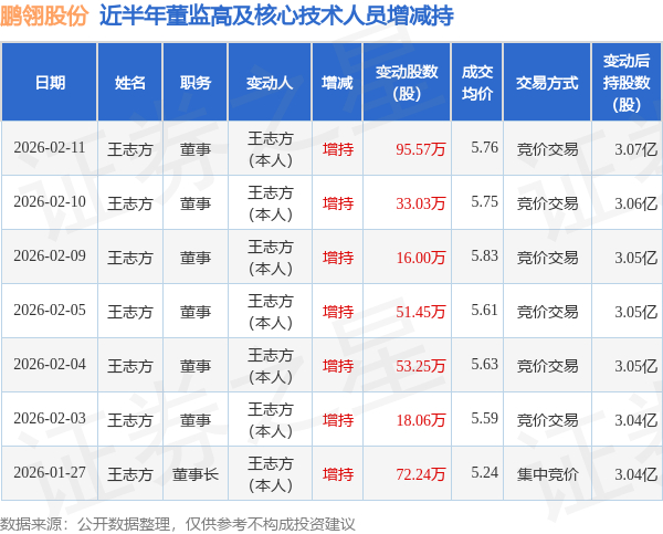 证券之星消息,根据2月12日市场公开信息、上市公司公告及交易所披露数据整理,鹏翎股份(300375)最新董监高及相关人员股份变动情况:2026年2月11日公司董事王志方共增持公司股份95.57万股,占公司总股本为0.1258%。变动期间公司股价下跌0.69%,2月11日当日收盘报5.72元。