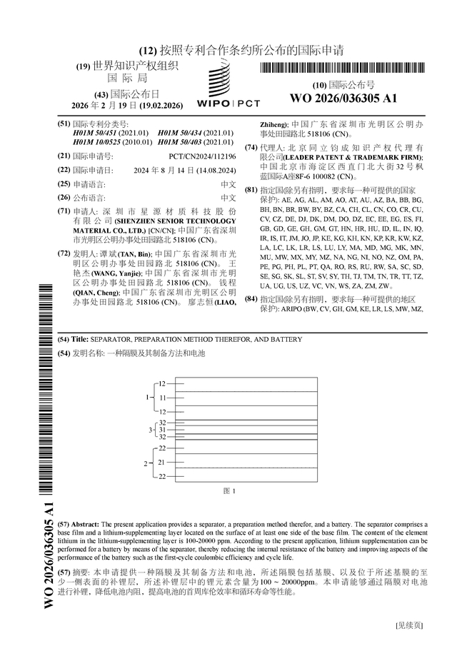 证券之星消息,根据企查查数据显示星源材质(300568)公布了一项国际专利申请,专利名为“一种隔膜及其制备方法和电池”,专利申请号为PCT/CN2024/112196,国际公布日为2026年2月19日。