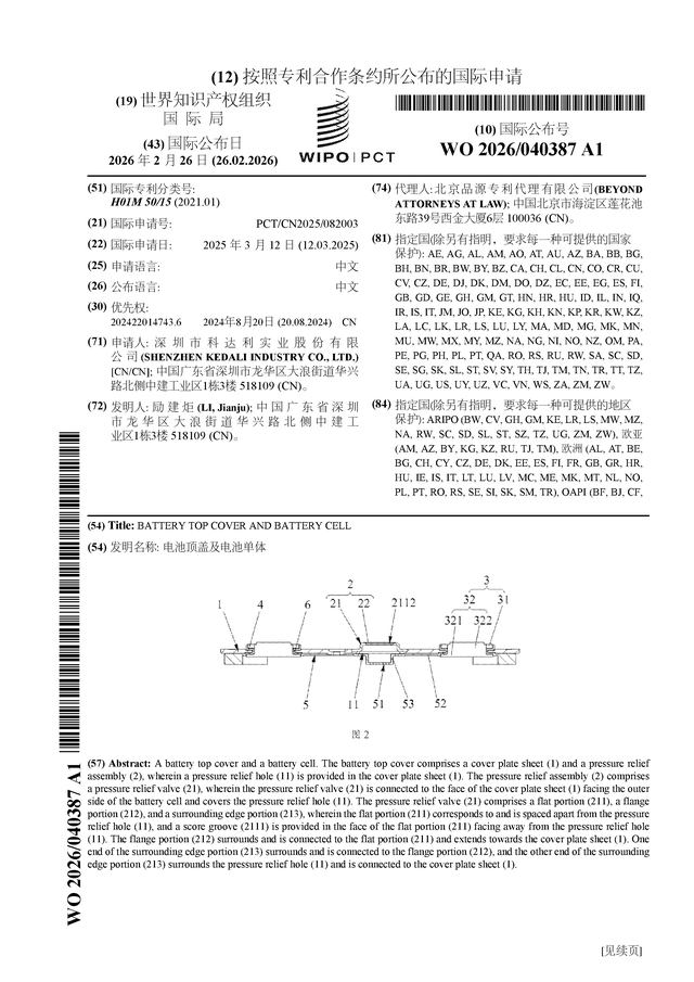 证券之星消息,根据企查查数据显示科达利(002850)公布了一项国际专利申请,专利名为“电池顶盖及电池单体”,专利申请号为PCT/CN2025/082003,国际公布日为2026年2月26日。