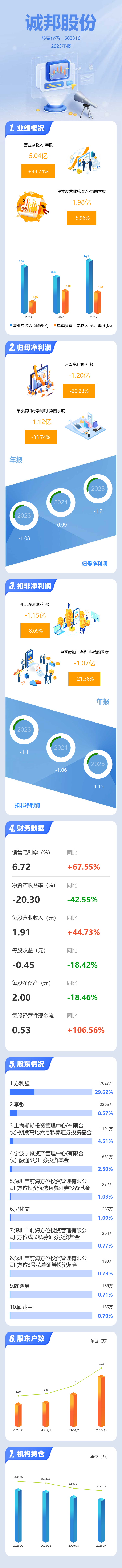 证券之星消息,诚邦股份2025年年报显示,当年度公司主营收入5.04亿元,同比上升44.75%;归母净利润-1.2亿元,同比下降20.23%;扣非净利润-1.15亿元,同比下降8.7%;其中2025年第四季度,公司单季度主营收入1.98亿元,同比下降5.97%;单季度归母净利润-1.12亿元,同比下降35.75%;单季度扣非净利润-1.07亿元,同比下降21.39%;负债率76.16%,投资收益-626.64万元,财务费用-1218.23万元,毛利率6.72%。