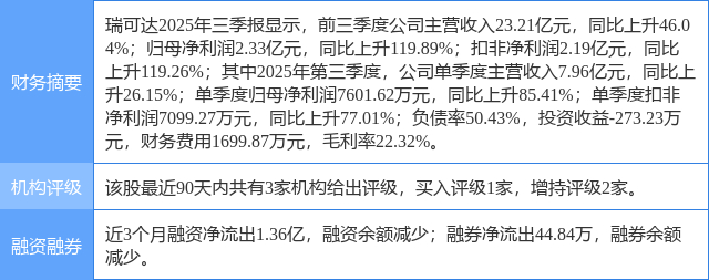 2025年12月28日,中邮证券研究员吴文吉,陈天瑜发布了对瑞可达的研报《连接AI,通信未来》,该研报对瑞可达给出“买入”评级。研报中预计公司2025/2026/2027年分别实现收入30/41/51亿元归母净利润3.0/4.3/5.5亿元,维持“买入”评级。证券之星数据中心根据近三年发布的研报数据计算,该研报作者对此股的盈利预测准确度为73.49%。