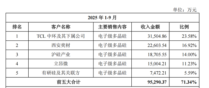 进一步研究发现,鑫华科技与第一大客户TCL中环之间的关系则更为复杂。2025年前三季度,TCL中环贡献了3.15亿元的销售额,占公司总营收的23.58%。