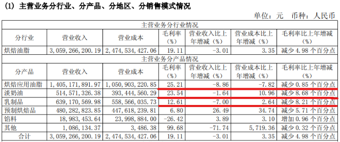 从销量数据来看,2025年,烘焙应用油脂同比下降15.94%,淡奶油和乳制品也分别减少5.95%和9.92%。销量收缩不仅进一步压缩了收入空间,也在成本持续攀升的背景下,加重了盈利端的承压程度。