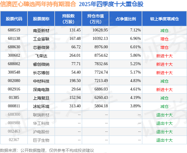 信澳匠心臻选两年持有期混合的前十大重仓股如下: