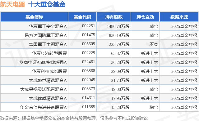 根据2025基金年报公募基金重仓股数据,重仓该股的公募基金共14家,其中持有数量最多的公募基金为华夏基金的华夏军工安全混合A。华夏军工安全混合A目前规模为38.4亿元,最新净值2.378(3月11日),较上一交易日下跌1.82%,近一年上涨57.07%。该公募基金现任基金经理为万方方。