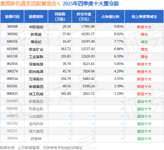 富国新机遇灵活配置混合A的前十大重仓股如下: