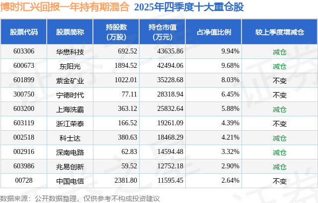 根据2025基金年报公募基金重仓股数据,重仓该股的公募基金共20家,其中持有数量最多的公募基金为博时基金的博时汇兴回报一年持有期混合。博时汇兴回报一年持有期混合目前规模为43.9亿元,最新净值1.1677(3月12日),较上一交易日下跌0.8%,近一年上涨63.45%。该公募基金现任基金经理为吴渭。吴渭在任的基金产品包括:博时汇智回报灵活配置混合,管理时间为2017年4月12日至今,期间收益率为223.86%;博时汇荣回报混合A,管理时间为2021年8月24日至今,期间收益率为37.45%。