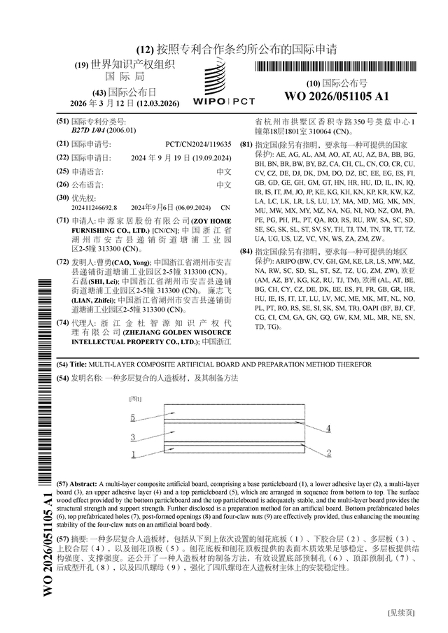 证券之星消息,根据企查查数据显示中源家居(603709)公布了一项国际专利申请,专利名为“一种多层复合的人造板材,及其制备方法”,专利申请号为PCT/CN2024/119635,国际公布日为2026年3月12日。