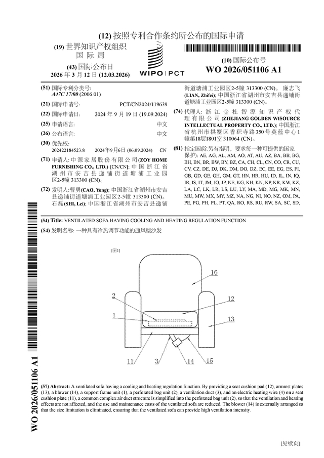 证券之星消息,根据企查查数据显示中源家居(603709)公布了一项国际专利申请,专利名为“一种具有冷热调节功能的通风型沙发”,专利申请号为PCT/CN2024/119639,国际公布日为2026年3月12日。