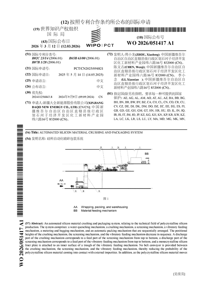 证券之星消息,根据企查查数据显示大全能源(688303)公布了一项国际专利申请,专利名为“硅料自动化破碎包装系统”,专利申请号为PCT/CN2025/094821,国际公布日为2026年3月12日。