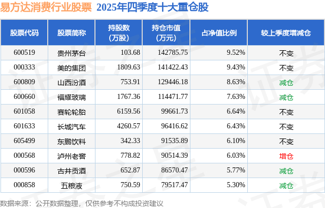 易方达消费行业股票的前十大重仓股如下: