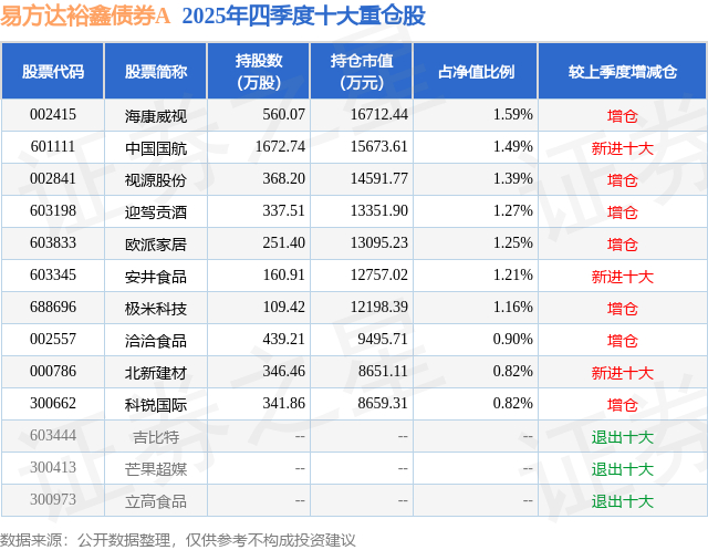 根据2025基金年报公募基金重仓股数据,重仓该股的公募基金共14家,其中持有数量最多的公募基金为易方达基金的易方达裕鑫债券A。易方达裕鑫债券A目前规模为60.5亿元,最新净值1.8061(3月13日),较上一交易日下跌0.25%,近一年上涨16.33%。该公募基金现任基金经理为胡文伯。胡文伯在任的基金产品包括:易方达鑫转招利混合A,管理时间为2023年3月16日至今,期间收益率为31.63%;易方达磐固六个月持有期混合A,管理时间为2023年6月21日至今,期间收益率为8.48%。