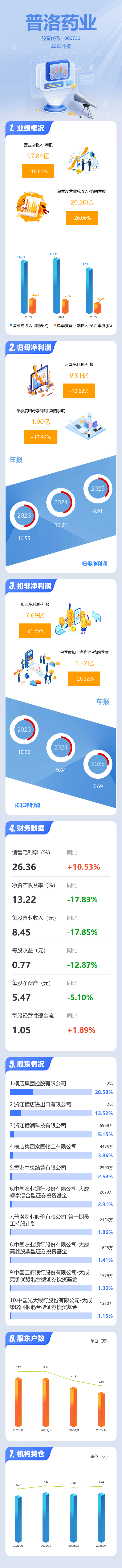 证券之星消息,普洛药业2025年年报显示,当年度公司主营收入97.84亿元,同比下降18.62%;归母净利润8.91亿元,同比下降13.62%;扣非净利润7.69亿元,同比下降21.86%;其中2025年第四季度,公司单季度主营收入20.2亿元,同比下降26.06%;单季度归母净利润1.9亿元,同比上升17.92%;单季度扣非净利润1.22亿元,同比下降20.33%;负债率48.48%,投资收益1978.09万元,财务费用-5875.59万元,毛利率26.36%。