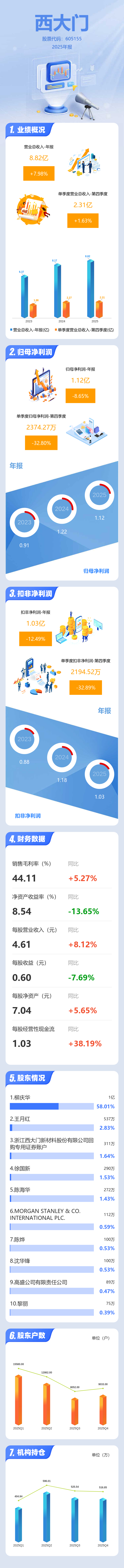 证券之星消息,西大门2025年年报显示,当年度公司主营收入8.82亿元,同比上升7.98%;归母净利润1.12亿元,同比下降8.66%;扣非净利润1.03亿元,同比下降12.5%;其中2025年第四季度,公司单季度主营收入2.31亿元,同比上升1.64%;单季度归母净利润2374.27万元,同比下降32.81%;单季度扣非净利润2194.52万元,同比下降32.89%;负债率8.53%,投资收益420.31万元,财务费用-90.0万元,毛利率44.11%。