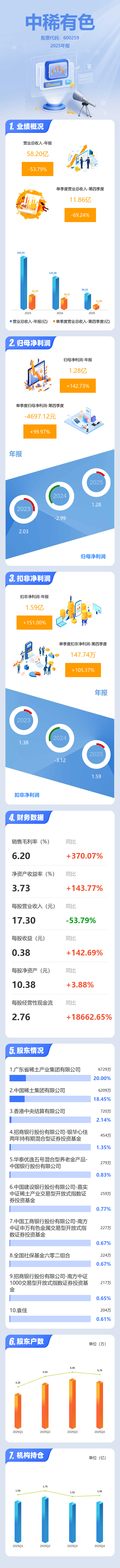 证券之星消息,中稀有色2025年年报显示,当年度公司主营收入58.2亿元,同比下降53.8%;归母净利润1.28亿元,同比上升142.73%;扣非净利润1.59亿元,同比上升151.01%;其中2025年第四季度,公司单季度主营收入11.86亿元,同比下降69.25%;单季度归母净利润-0.47万元,同比上升99.98%;单季度扣非净利润147.74万元,同比上升105.38%;负债率45.77%,投资收益2.69亿元,财务费用7057.04万元,毛利率6.2%。