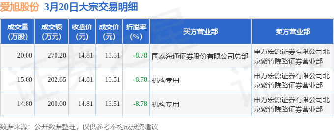 证券之星消息,3月20日爱旭股份发生大宗交易,交易数据如下: