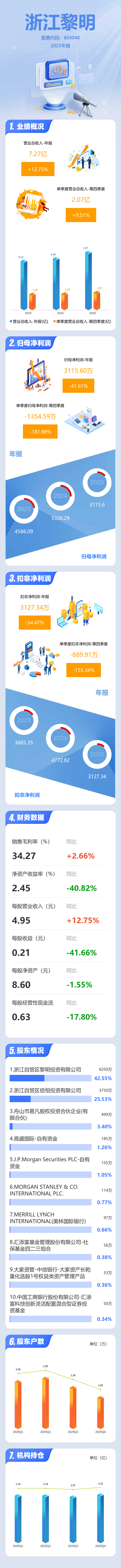 证券之星消息,浙江黎明2025年年报显示,当年度公司主营收入7.27亿元,同比上升12.75%;归母净利润3115.6万元,同比下降41.61%;扣非净利润3127.34万元,同比下降34.48%;其中2025年第四季度,公司单季度主营收入2.07亿元,同比上升9.52%;单季度归母净利润-1354.59万元,同比下降181.69%;单季度扣非净利润-889.91万元,同比下降155.34%;负债率21.91%,投资收益718.58万元,财务费用-239.53万元,毛利率34.27%。