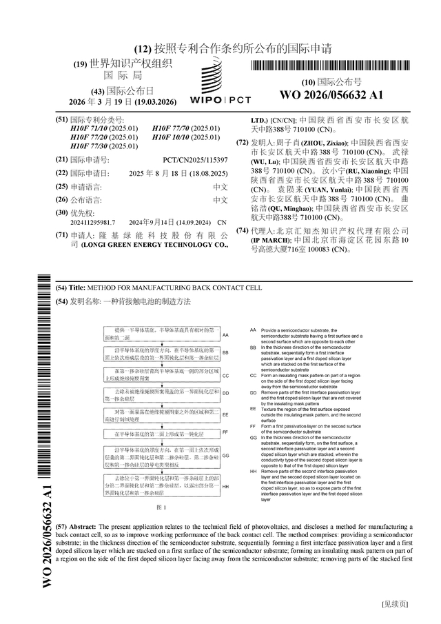 证券之星消息,根据企查查数据显示隆基绿能(601012)公布了一项国际专利申请,专利名为“一种背接触电池的制造方法”,专利申请号为PCT/CN2025/115397,国际公布日为2026年3月19日。