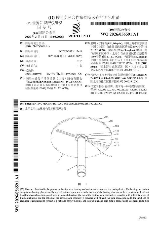 证券之星消息,根据企查查数据显示盛美上海(688082)公布了一项国际专利申请,专利名为“加热机构及基板处理装置”,专利申请号为PCT/CN2025/113418,国际公布日为2026年3月19日。