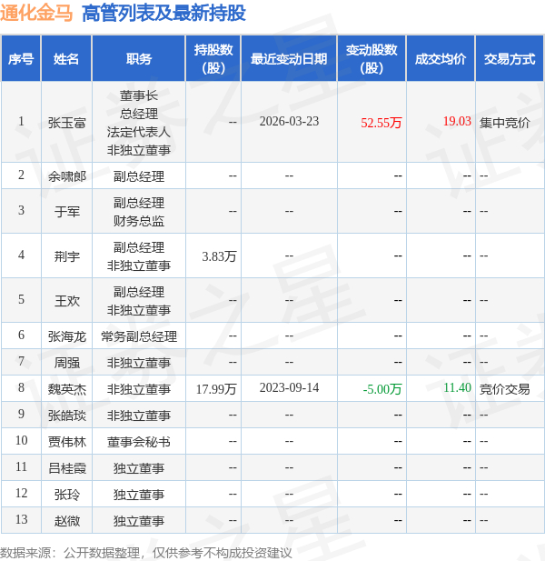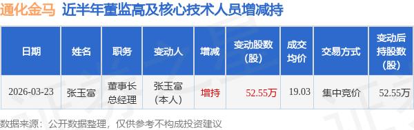 证券之星消息,根据3月23日市场公开信息、上市公司公告及交易所披露数据整理,通化金马(000766)最新董监高及相关人员股份变动情况:2026年3月23日公司董事长,总经理张玉富共增持公司股份52.55万股,占公司总股本为0.0544%。变动期间公司股价下跌6.39%,3月23日当日收盘报18.46元。