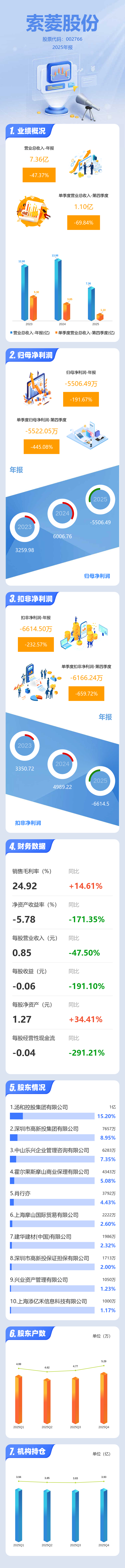 证券之星消息,索菱股份2025年年报显示,当年度公司主营收入7.36亿元,同比下降47.38%;归母净利润-5506.49万元,同比下降191.67%;扣非净利润-6614.5万元,同比下降232.58%;其中2025年第四季度,公司单季度主营收入1.1亿元,同比下降69.85%;单季度归母净利润-5522.05万元,同比下降445.09%;单季度扣非净利润-6166.24万元,同比下降659.72%;负债率18.41%,投资收益714.24万元,财务费用-274.71万元,毛利率24.92%。