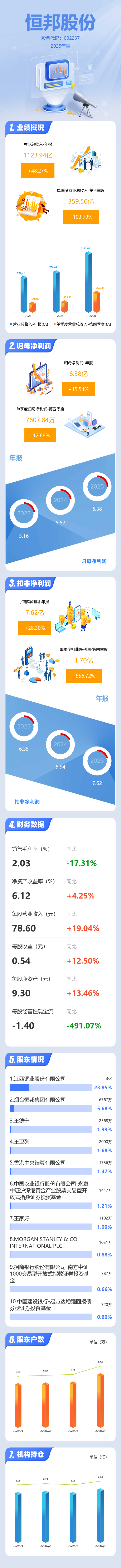 证券之星消息,恒邦股份2025年年报显示,当年度公司主营收入1123.94亿元,同比上升48.28%;归母净利润6.38亿元,同比上升15.55%;扣非净利润7.62亿元,同比上升28.3%;其中2025年第四季度,公司单季度主营收入359.5亿元,同比上升103.8%;单季度归母净利润7607.84万元,同比下降12.88%;单季度扣非净利润1.7亿元,同比上升556.72%;负债率64.0%,投资收益1.45亿元,财务费用3.47亿元,毛利率2.03%。