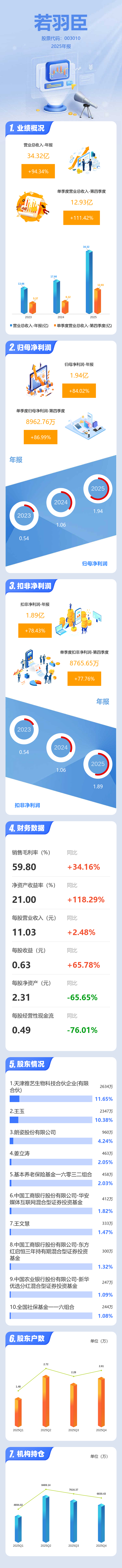 证券之星消息,若羽臣2025年年报显示,当年度公司主营收入34.32亿元,同比上升94.35%;归母净利润1.94亿元,同比上升84.03%;扣非净利润1.89亿元,同比上升78.43%;其中2025年第四季度,公司单季度主营收入12.93亿元,同比上升111.42%;单季度归母净利润8962.76万元,同比上升86.99%;单季度扣非净利润8765.65万元,同比上升77.77%;负债率67.07%,投资收益356.98万元,财务费用3004.57万元,毛利率59.8%。