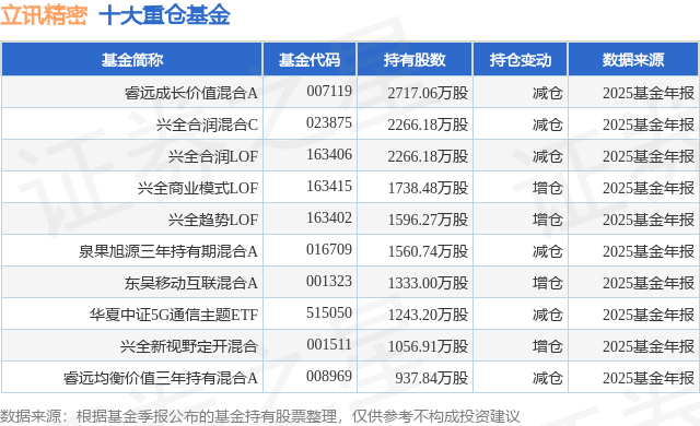 重仓立讯精密的前十大公募基金请见下表: