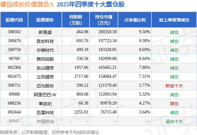 睿远成长价值混合A的前十大重仓股如下: