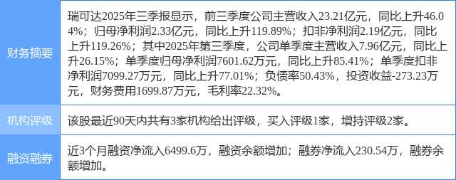 2025年12月28日,中邮证券研究员吴文吉,陈天瑜发布了对瑞可达的研报《连接AI,通信未来》,该研报对瑞可达给出“买入”评级。研报中预计公司2025/2026/2027年分别实现收入30/41/51亿元归母净利润3.0/4.3/5.5亿元,维持“买入”评级。证券之星数据中心根据近三年发布的研报数据计算,该研报作者对此股的盈利预测准确度为73.49%。