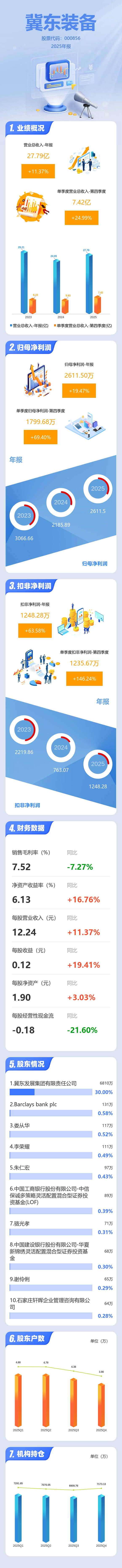 证券之星消息,冀东装备2025年年报显示,当年度公司主营收入27.79亿元,同比上升11.37%;归母净利润2611.5万元,同比上升19.47%;扣非净利润1248.28万元,同比上升63.59%;其中2025年第四季度,公司单季度主营收入7.42亿元,同比上升24.99%;单季度归母净利润1799.68万元,同比上升69.41%;单季度扣非净利润1235.67万元,同比上升146.25%;负债率78.97%,投资收益724.15万元,财务费用414.33万元,毛利率7.52%。