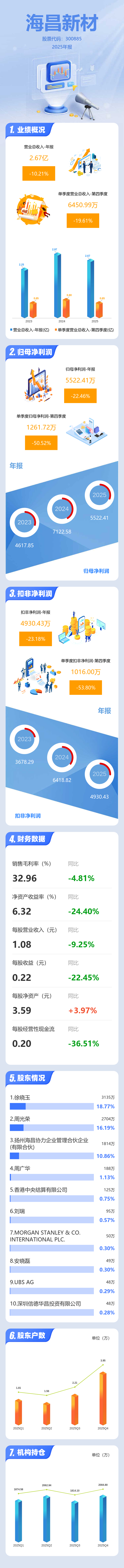 证券之星消息,海昌新材2025年年报显示,当年度公司主营收入2.67亿元,同比下降10.22%;归母净利润5522.41万元,同比下降22.47%;扣非净利润4930.43万元,同比下降23.19%;其中2025年第四季度,公司单季度主营收入6450.99万元,同比下降19.62%;单季度归母净利润1261.72万元,同比下降50.52%;单季度扣非净利润1016.0万元,同比下降53.81%;负债率19.54%,投资收益538.4万元,财务费用-687.51万元,毛利率32.96%。
