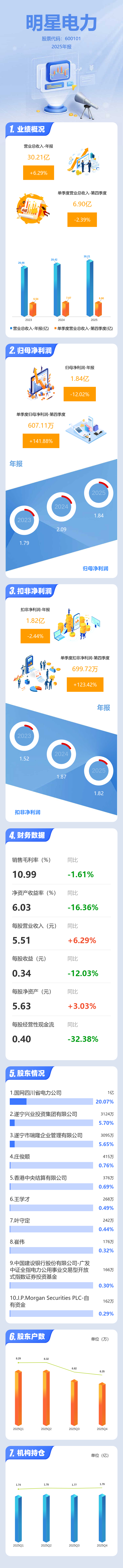 证券之星消息,明星电力2025年年报显示,当年度公司主营收入30.21亿元,同比上升6.29%;归母净利润1.84亿元,同比下降12.02%;扣非净利润1.82亿元,同比下降2.44%;其中2025年第四季度,公司单季度主营收入6.9亿元,同比下降2.39%;单季度归母净利润607.11万元,同比上升141.88%;单季度扣非净利润699.72万元,同比上升123.42%;负债率25.07%,投资收益1447.82万元,财务费用-1371.88万元,毛利率10.99%。