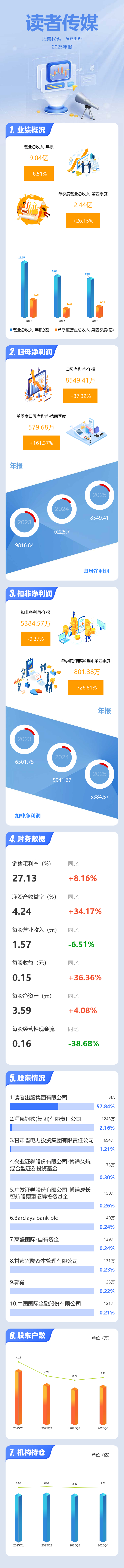 证券之星消息,读者传媒2025年年报显示,当年度公司主营收入9.04亿元,同比下降6.51%;归母净利润8549.41万元,同比上升37.32%;扣非净利润5384.57万元,同比下降9.38%;其中2025年第四季度,公司单季度主营收入2.44亿元,同比上升26.16%;单季度归母净利润579.68万元,同比上升161.38%;单季度扣非净利润-801.38万元,同比下降726.81%;负债率20.82%,投资收益653.25万元,财务费用-1892.87万元,毛利率27.13%。